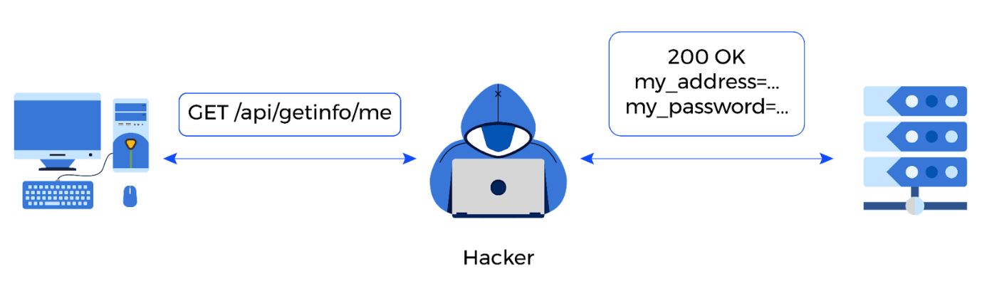 Without HTTPS, communication between the end user and the server is sent in cleartext, allowing the attacker to read sensitive information. The intercepted information may not be the only sensitive data the API transmits. Cookies and tokens compromised from an API call can allow an attacker to hijack a victim’s session.