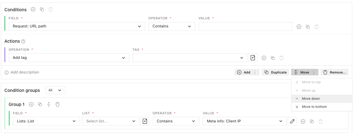 Use built-in controls to move conditions up, down, or to the top—giving you more control over performance by placing expensive checks where they belong.